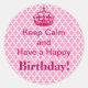 Pretty pink keep calm birthday stickers--perfect for adding a little pink pizzazz to gift bags or birthday card envelopes! Featuring a magenta crown and lettering atop an always stylish quarterfoil background. Fit for a princess or a queen! These stickers have a high quality glossy finish and adhere well to any surface including paper, ribbon, plastic, cardboard, and glass.