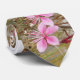 Image of three pink blossoms is repeated up the length of the tie with smaller tiles on the back/narrow end. Burgundy leaves and yellow/green grasses are the background. Onagraceae Gaura lindheimeri.