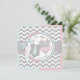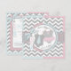 A sweet gender reveal party invitation card featuring chic grey and white chevron print and an adorable polka dot jumper with a blue tie and a sweet pink tutu.