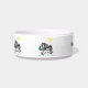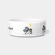 A White Medium Ceramic Pet Bowl, with the option to customise = " Your Dog's name here! with drawings of a Cartoon dog, Tiffany and her Frisbee, = 4 times around the bowl, = (Art by P.J.M.).