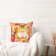 Tiger cat pillow with red decorative designs background. Very colorful with red white, oranges with dark brown accents. Cute, decorative.and adds charm and coziness to room.