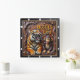 This striking square wall clock features a highly dimensional illustration of a large, fierce tiger roaring and a small, smiling monkey nestled beside it. The entire design is rendered in vibrant orange, brown, and dark gray tones, strongly suggesting a deep carved relief or Engraved Wood Look. The tiger has textured stripes and is positioned on the left, while the cheerful monkey is on the right, looking forward. They are framed by a central hollow tree trunk and numerous stylized leaves carved into the perimeter. The carving style gives the entire image a strong three-dimensional, sculpted quality. The prominent, three-dimensional embossed text "BESTIES FOR LIFE" is carved across the top center. The clock face features a simple clock face border with large, white, numbered tick marks (1 to 12) integrated into the outer frame. The artwork is surrounded by a thick, dark brown decorative border that resembles a black wood frame.