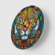 Vibrant, stylised depiction of a tiger's face, chraacterised by its striking orange and black fur patterns. The eyes of the tiger are a vivid green, adding to the intensity of its expression. Surrounding the tiger's face is a rich tapestry of colourful foliage and flowers, integrating shades of deep greens, blues, and warm oranges. The overall composition merges the natural beauty of the tiger with intricate botanical elements, creating a visually stunning and harmonious piece of art. The use of bold colours and detailed textures enhances the dynamic and enchanting quality of the image.