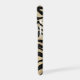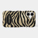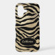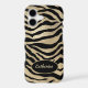 Jet black tiger stripes are laid across a burnished antique gold background to make a stunning phone case. A gold lined black oval at the bottom holds your name or other text, also in gold. Exotic!