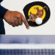 decorative artwork of a big asian striped tiger crouching across a big golden sun on a ping pong paddle.