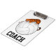 practical and fun clipboard printed with a tiger crouching on a volleyball. Front of clipboard has the word 'coach' and the back of the clipboard has "tiger volleyball" on the back. All of the words can be customised to reflect player names, numbers, or school name.
