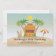 Adult summer birthday party featuring a beach scene with a tiki bar, palm trees & surf boards.