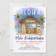 Tropical Christmas party invitation features Santa enjoying a vacation at a Tiki bar on the beach under the moon and stars with palm trees, holiday string lights and Hawaiian "Aloha" and "Mele Kalikimaka" greetings. Tropical cocktails, a pineapple, hibiscus and palm leaves, a surfboard and a parrot in a pirate hat decorate the bar area. The reverse side is twilight blue. Art by KL Stock