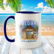 Tropical Christmas mug features Santa enjoying a vacation at a Tiki bar on the beach under the moon and stars with palm trees, holiday string lights and Hawaiian "Aloha" and "Mele Kalikimaka" greetings. Tropical cocktails, a pineapple, hibiscus and palm leaves, a surfboard and a parrot in a pirate hat decorate the bar area. The lower greeting can be personalised. Art by KL Stock
