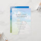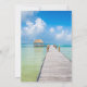 Tiki hut on the water, tropical paradise wedding invitation. Casual and modern, destination tropics, custom invitation with printed text spaced between lines. Use uppercase lettering to mimic this design. The background image is blue-green ocean water, blue sky with fluffy white clouds, and a long boardwalk / dock that ends with a thatched roof gathering spot over the sea. Reverse has a brighter image to match the front. Need changes? Contact me @ bluehydpdc@gmail.com