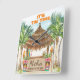 Tropical Tiki theme wall clock feature a watercolor Tiki bar on the beach (complete with a parrot and cocktails) framed by palm trees, Tiki torches and totems with "Aloha" and "It's Tiki Time" captions in island style fonts. The name and caption can be personalised.