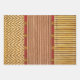 Tropical island tiki style with faux textures of bamboo, woven reed, and rattan,,, along with stripes of Polynesian style tiki icons in red, orange, and brown.