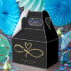 Elegant black and gold wedding favour box with text Til Death do us Part in infinity symbol with heart. Personalise it with your wedding details.