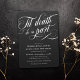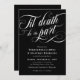 Elegant dark Halloween or goth wedding invitation with Til death do us part written in a swirly white calligraphy script. Add your invitation wording in white against a black background.
