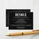 Black and white gothic or Halloween wedding invitation details card to match the suite with the website, reception information, accommodation, and transportation info. It features a spooky or gothic font and a brushed black backing.