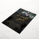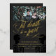 Elegant dark Halloween or goth wedding save the date with Til death do us part written in a swirly gold foil calligraphy script. Add your wedding information in gold against a dark grey background with black skeletons and personalise with a photo!