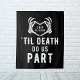 Wedding party or reception banner with the quote "'Til death do us part" with skeleton hands forming a heart. Black backdrop with an editable date and the bride and groom's initials. Be sure to visit our collection to see more coordinating items that match this design for your special event.