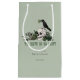 These elegant Til Death Do Us Party Irish skull bridesmaid gift bags feature hand-drawn Irish & gothic themed illustrations in black ink, showcasing a skull and a black crow adorned with green roses, leaves, berries, wildflowers and green clovers. Elegant sage green background. All text is editable.