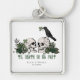This romantic goth "Til Death Do Us Part" Irish St. Patrick's Day wedding key chains feature hand-drawn Irish & gothic themed illustrations in black ink, showcasing husband and wife skulls and a black crow adorned with green roses, leaves, berries, wildflowers and green clovers.