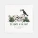 These elegant gothic "Til Death Do Us Part" Irish St. Patrick's Day wedding napkins feature hand-drawn Irish & gothic themed illustrations in black ink, showcasing husband and wife skulls and a black crow adorned with green roses, leaves, berries, wildflowers and green clovers. Elegant white background. All text is editable.