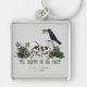 This romantic goth "Til Death Do Us Part" Irish / St. Patrick's Day wedding key chains feature hand-drawn Irish & gothic themed illustrations in black ink, showcasing husband and wife skulls and a black crow adorned with green roses, leaves, berries, wildflowers and green clovers. Elegant soft grey background. All text is editable.