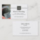 This construction flooring business card has a photograph on the left side of an orange bucket filled with grey mortar and a trowel on the edge of the bucket.  In the background, you can see some tile that is being laid.  On the right, there is a pewter grey square at the top with two stripes behind.  There, you can easily customise the monogram initial.  Below and on the backside, you can personalise all of the details of the business.