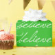 Holiday wrapping paper with tiled white text that reads I Believe! You can customise the green background to be any colour you want.