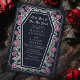 Make a bold statement of eternal love. This gothic wedding invitation features ‘Till Death Do Us Part’ in a coffin-shaped frame, adorned with thorns, roses, and silver accents against a deep blue background. Perfect for a hauntingly romantic celebration! Personalise the text, font, and background colour to suit your design preferences. Matching Items in our shop for a complete party theme. Please note that the silver on the BACK of the invitation is NOT real foil and is printed in flat colours.