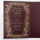 Make a bold statement of eternal love. This gothic wedding invitation features ‘Till Death Do Us Part’ in a coffin-shaped frame, adorned with thorns, roses, and gold accents against a rich red background. Perfect for a hauntingly romantic celebration! Personalise the text, font, and background colour to suit your design preferences. Matching Items in our shop for a complete party theme. Please note that the gold on the invitation is NOT real foil and is printed in flat colours