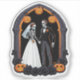 A hauntingly romantic Halloween wedding artwork featuring a skeleton bride and groom holding hands under a gothic arch, surrounded by glowing jack-o’-lanterns and black roses. Perfect for spooky weddings, gothic couples, or Halloween décor.