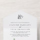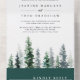 Elegant fall or winter wedding invitation features a copse of tall watercolor pine trees in shades of greyed sage and hunter green. Personalise with your wedding details in chic soft off-black lettering, topped by your initials joined by a script ampersand to create a beautiful custom monogram. A chic choice for elegant autumn or winter weddings in mountain or forest settings.