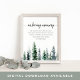 Designed to match our Timber Grove wedding collection, this winter woodland chic sign is perfect for placing at a memorial table or display honouring loved ones who have passed. Personalise the header and body text (shown with "In Loving Memory" and a brief poem), accented with a bottom border of watercolor pine trees in shades of hunter and forest green.