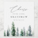 Elevate your wedding bar or favour table with this elegant wine label from the Timber Grove collection by Redwood & Vine Design Co. A row of watercolor pine trees stretches across the bottom, with a graceful script and serif combination above to showcase your names and wedding date. Perfect for outdoor weddings, winter lodge celebrations, or rustic vineyard receptions. Fully customisable to fit any event style.