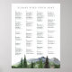 This printable or printed seating chart displays guest names in alphabetical order, making it easy for attendees to find their place. Part of the Timberline collection by Redwood & Vine Design Co., it features a green forest and mountain watercolor motif—ideal for rustic winter weddings, national park venues, or outdoor celebrations. Customisable for your guest list and wedding details.
