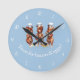 Piggy chefs cook up some bacon and eggs on this cute numbered kitchen wall clock. The background is a soft blue. The white text reads, "Time for bacon & eggs!".