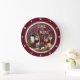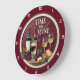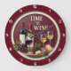 This is a decorative wall clock featuring the phrase "TIME FOR WINE" in large, three-dimensional light-colored letters on a deep maroon-red face. The bottom of the clock face is illustrated with bottles of red and white wine, several full wine glasses, clusters of purple grapes, and cheese wedges. The items rest on a depicted wooden surface. A beige, distressed ring separates the central image from the outer maroon rim. The design may look real due to the high detail and three-dimensional texture in the artwork.