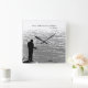 Easily customise or remove the text on this wall clock which features a black and white image of a solitary fisherman standing on a rock ledge at Seneca Lake in Geneva, New York. The text, by the Transcendentalist author, naturalist and philosopher, Henry David Thoreau, reads: Time is but the stream I go a-fishing in. It is taken from Thoreau's famous book, Walden, which he wrote in Concord, Massachusetts about his life in the woods surrounding Walden Pond. It was published in 1854.