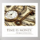 Time is money quote by Benjamin Franklin. An old pocket watch, a skeleton key atop US currency.