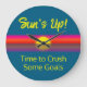 Keep your eye on your goals with this cute affirmation clock. It features sunrise artwork with the phrase "Sun's Up! Time to Crush Some Goals" in bright yellow. An encouraging message for anyone.