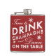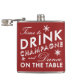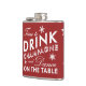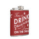 This is a fun and flirty flask that says, "Time to Drink Champagne and Dance on the Table" on a cranberry red background decorated with snowflakes, making it a perfect holiday gift.