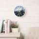 For the great outdoors enthusiast! Decorate a living space with this stylish wall clock with white numerals and features a scenic photo image of snow capped Mount Baker, located in the Pacific Northwest, along with a saying that reads, Time to head to the mountains." Select your clock style and size. Use to decorate a living room, dining room, kitchen, bedroom, or any other room.