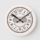 A cute illustrated, time to knit themed round clock, featuring a ball of yarn. The text reads: time to knit and knit purl repeat. A light pastel peach background. A gift for an avid knitter. A great gift for an avid knitters studio or crafters corner.
