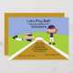 Start your celebration off with this adorable invite. Time to play ball! Invite your guests to a party at a field, your house, a park or a barbecue. This invitation in set as a baseball field. There's a brown haired boy standing up catching the ball. He is wearing a blue & red outfit. And there's another player on his stomach catching the ball wearing a blue & grey uniform. It has a light blue sky background. Check out the many of invitations and products in this line. © jWeible