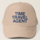 TIME TRAVEL AGENT fun slogan on trucker hat, blue, bold typography, fun statement, inspired by tv character frank rossitano. best for space vehicle owners.