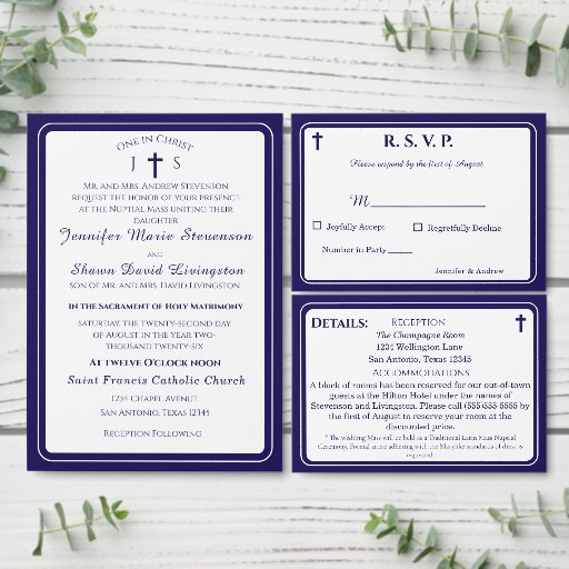 Reverse features a navy-blue background with initial of couple's last name displayed in center in an elegant white font. Designed to coordinate with the Timeless Catholic Monogrammed Wedding Suite.