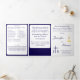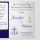 Interior is of a white background with navy-blue border. With explanations of the Mass displayed throughout, this elegant design also includes the name of the wedding officiant, names of altar servers, names of the parents of the bride and parents of the groom, wedding party names including the names for a maid-of-honor and best man, room for up to seven bridesmaids and groomsmen names, plus the names of the flower-girl and ring bearer. In addition, design of back cover features your text, a bible verse (or your message) and a prayer request for the happy couple against a navy background. All text is customizable. Designed to coordinate with the "Timeless Catholic Monogrammed Wedding Suite" collection.