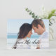 Stylish save the date photo announcement featuring a transparent white banner with elegant modern calligraphy script saying "Save the Date".