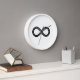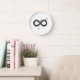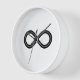 This clock's design "Timeless Infinite Minimalism" is defined by Infinite Simplicity. It reflects the elegance of minimalism and unlimited possibilities, bringing a sense of luxury to any decor, with a black infinity symbol against a white background.