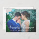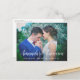 An elegant wedding save the date postcard designed to accommodate your favourite horizontal or landscape orientated full-bleed engagement photo. Your names appear as a white text overlay in hand lettered calligraphy script. Personalise with your wedding date and wedding location beneath.