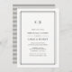 Elegant, simple and formal, our Timeless monogram rehearsal dinner invitation in black and white features a geometric border framing your rehearsal dinner details in classic lettering, topped by your initials, monogram or duogram.